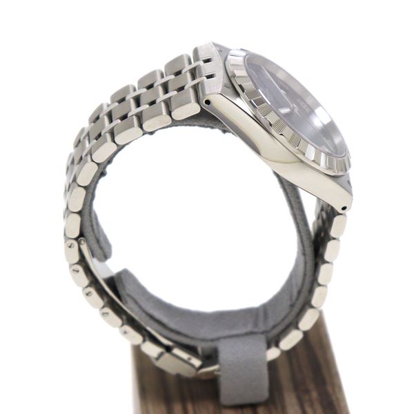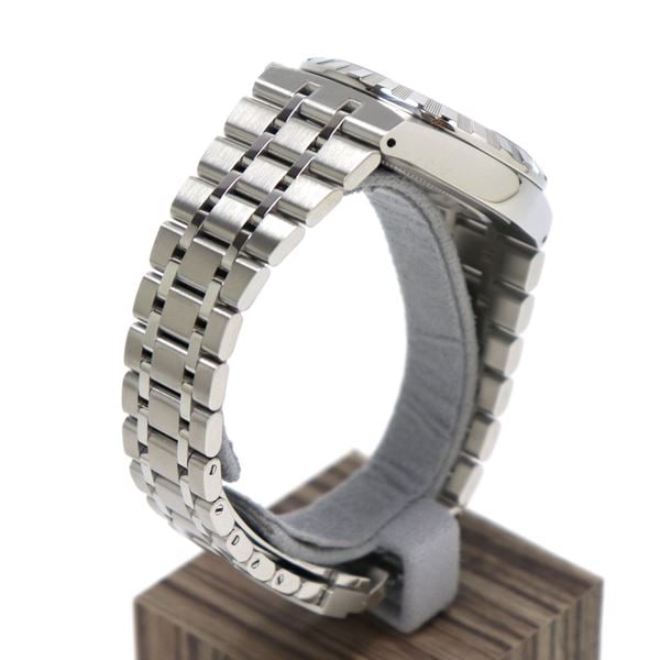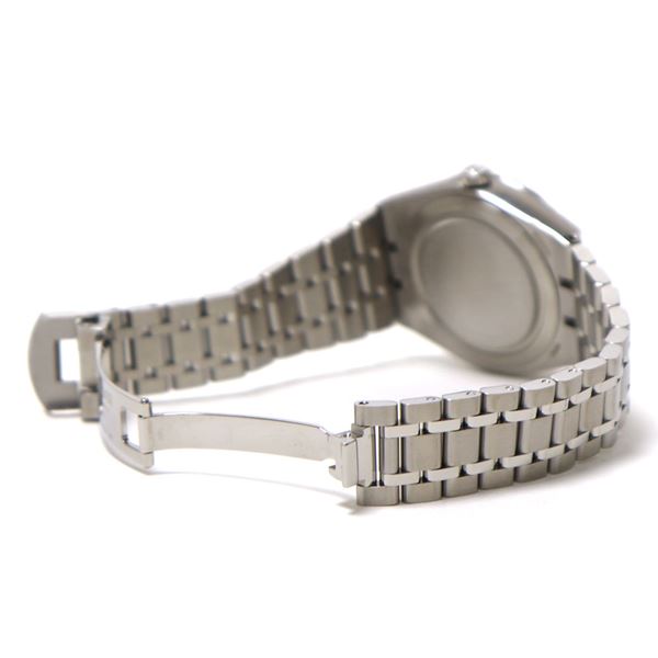 | コメント | ブレスレットとラグが一体化した存在感抜群の時計です。 ブルーの文字盤にローマ数字をあしらい、スーツの袖口にもフィットする38ミリのケースサイズ。 高級感ある1本です。 |